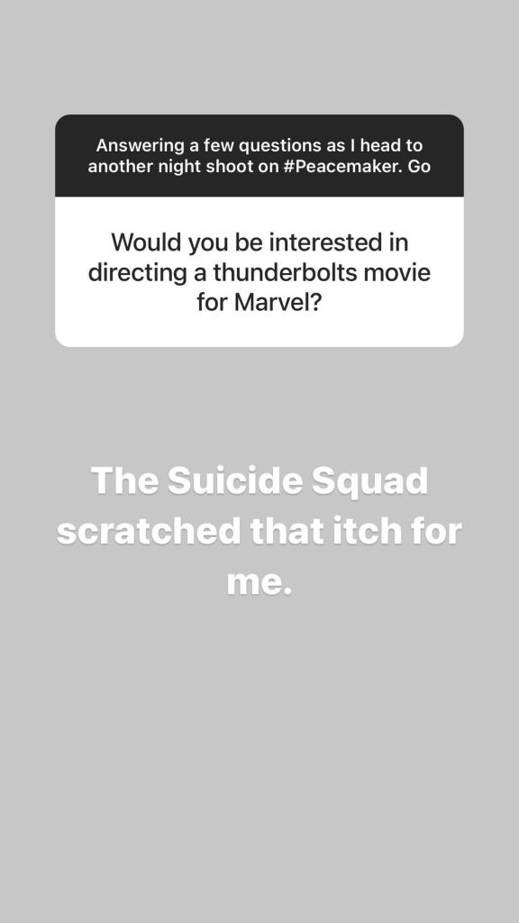 When Gunn was fired from the third Guardians movie he met with Warner Bros. and led to him writing/directing their sequel The Suicide Squad. During a Q&A session on his Instagram stories, James reaffirmed to a fan that he isn’t looking to make a Thunderbolts movie for Marvel Studios and that The Suicide Squad “scratched that itch.”
